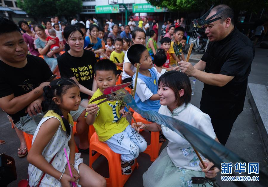 7月21日,“衛(wèi)家班皮影戲”劇團(tuán)的藝人們在和睦橋村的文化禮堂前給孩子們演示皮影戲道具。新華社記者徐昱攝
