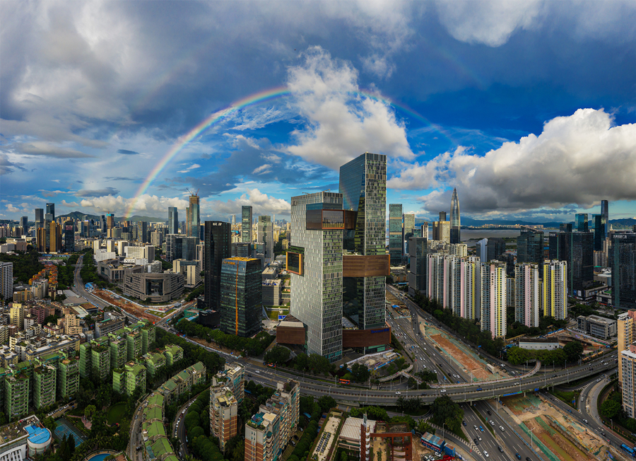 2019年8月29日傍晚,雨后的深圳灣出現(xiàn)雙彩虹,圖為騰訊濱海大廈上空的彩虹。