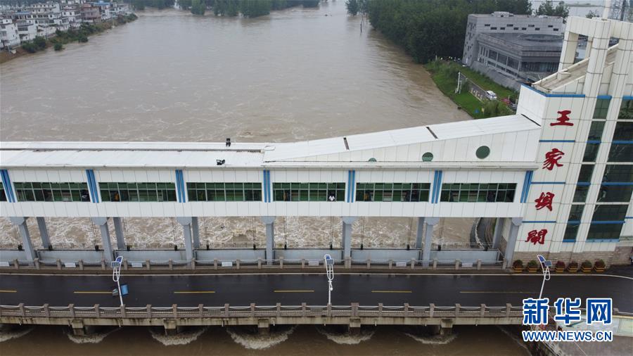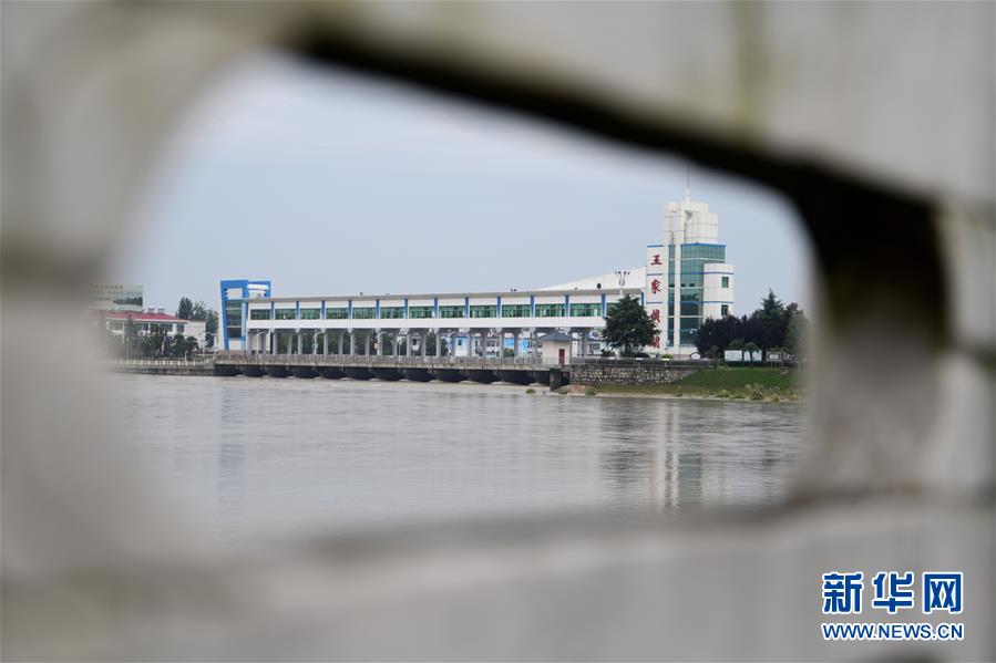 這是7月22日在安徽省阜南縣拍攝的淮河王家壩閘。7月22日14時,淮河王家壩水位降至28.73米,超警戒水位1.23米,低于保證水位0.57米。新華社記者張端攝