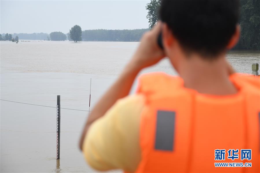 7月22日,安徽省阜南縣王家壩水文站的工作人員在查看水位。7月22日14時,淮河王家壩水位降至28.73米,超警戒水位1.23米,低于保證水位0.57米。新華社記者張端攝