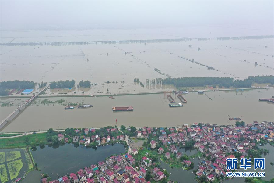 這是7月21日拍攝的被淹的南京市高淳區(qū)陽江鎮(zhèn)勝利圩(畫面左側(cè))(無人機(jī)照片)。新華社記者季春鵬攝