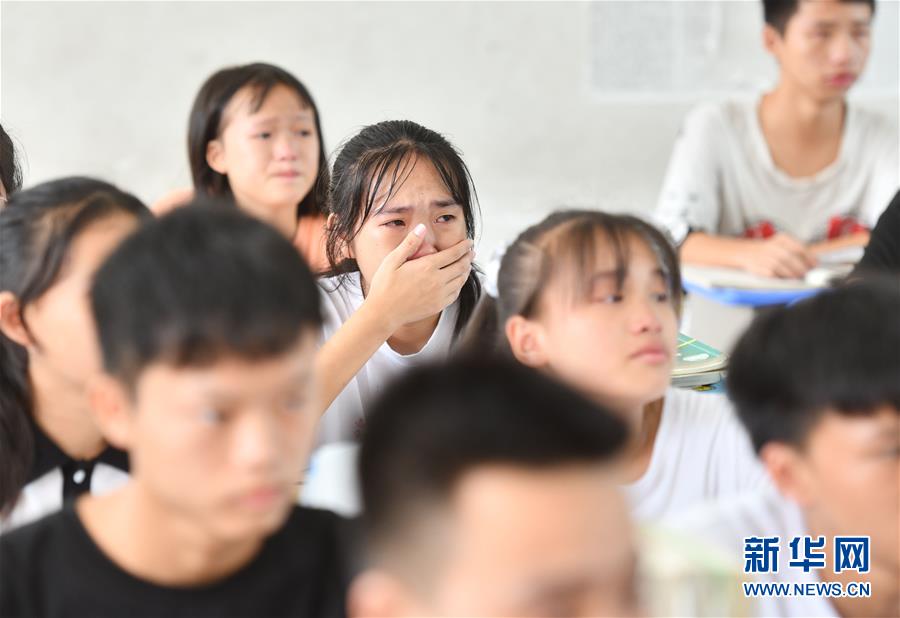 在融水苗族自治縣丹江中學(xué)1708班舉辦的送別班會(huì)上,一名學(xué)生聽(tīng)到支教老師溫昌浩的臨別寄語(yǔ)時(shí)流淚(7月23日攝)。新華社記者黃孝邦攝