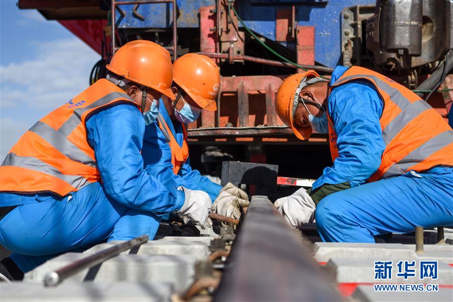 中鐵一局的施工人員在格庫(kù)鐵路新疆段固定最后一組軌排(7月21攝)。新華社記者 丁磊 攝