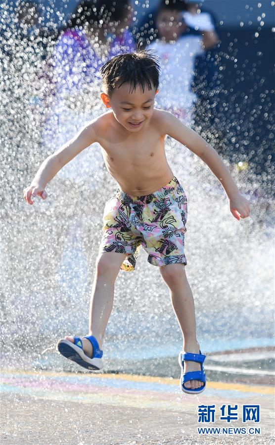 7月24日,一名小男孩在北京華熙LIVE·五棵松商業(yè)街區(qū)的一處噴泉戲水。北京市氣象局7月24日傍晚發(fā)布稱,24日截至16時30分,平原大部分地區(qū)出現(xiàn)37℃以上高溫天氣,局地氣溫超過40℃。北京市已于23日發(fā)布高溫藍(lán)色預(yù)警,預(yù)計25日全市大部分地區(qū)日最高氣溫仍將達(dá)35℃以上。新華社記者陳曄華攝