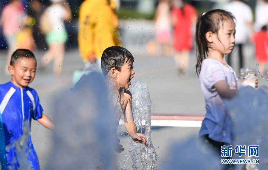7月24日,孩子們在北京華熙LIVE·五棵松商業(yè)街區(qū)的一處噴泉戲水。北京市氣象局7月24日傍晚發(fā)布稱,24日截至16時30分,平原大部分地區(qū)出現(xiàn)37℃以上高溫天氣,局地氣溫超過40℃。北京市已于23日發(fā)布高溫藍色預(yù)警,預(yù)計25日全市大部分地區(qū)日最高氣溫仍將達35℃以上。新華社記者陳曄華攝