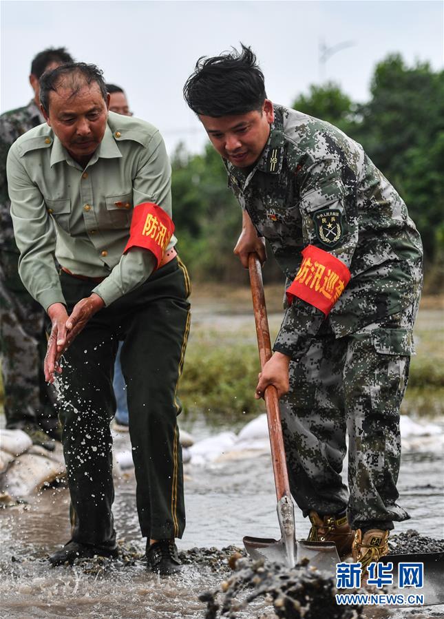 7月18日,陳申桃(左)和兒子在東升堤附近處理一起泡泉險(xiǎn)情。新華社記者胡晨歡攝