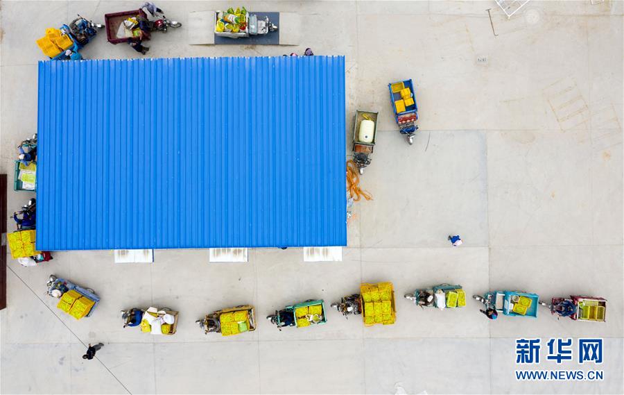 在寧夏紅寺堡區(qū)柳泉鄉(xiāng)柳泉村黃花菜晾曬場,村民排隊(duì)稱重黃花菜(7月11日攝,無人機(jī)照片)。新華社記者 楊植森 攝