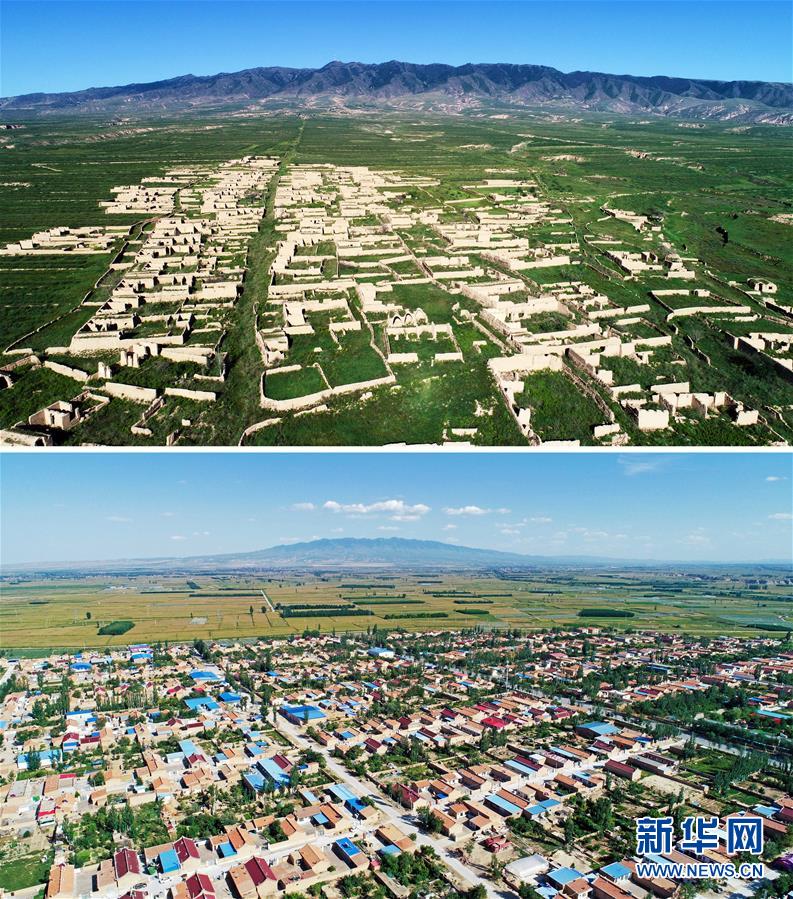 拼版照片:上圖為經(jīng)過多年的生態(tài)修復,寧夏吳忠市紅寺堡區(qū)新莊集鄉(xiāng)移民舊址已逐漸被綠色覆蓋;下圖為戈壁荒灘上建起的紅寺堡移民新村(2018年9月8日攝,無人機照片)。新華社記者 王鵬 攝