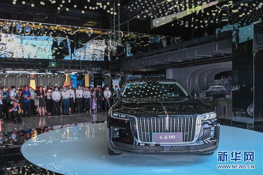 7月28日,參觀者參觀紅旗創(chuàng)新大廈內(nèi)展出的紅旗H9轎車。