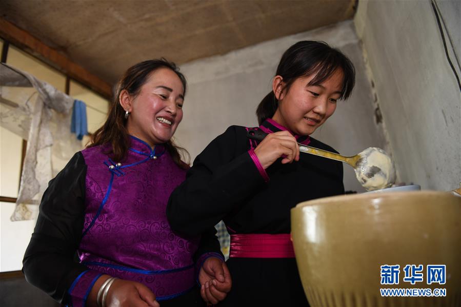 呼格吉勒的妻子薩如拉(左)在土坯房里教女兒蘇日娜制作奶食品(7月23日攝)。新華社記者劉磊攝