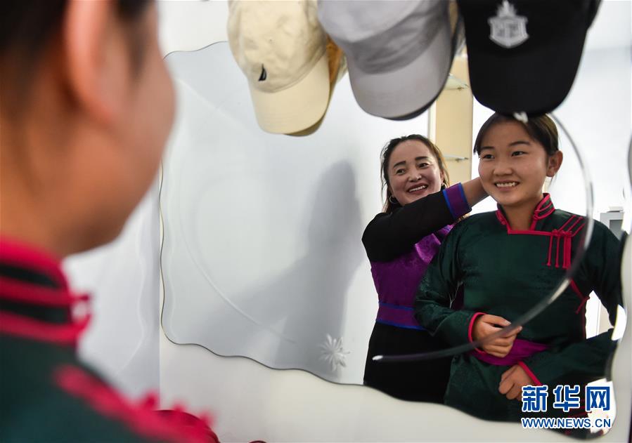 呼格吉勒的妻子薩如拉在新房里為女兒蘇日娜整理頭發(fā)(7月26日攝)。新華社記者徐欽攝