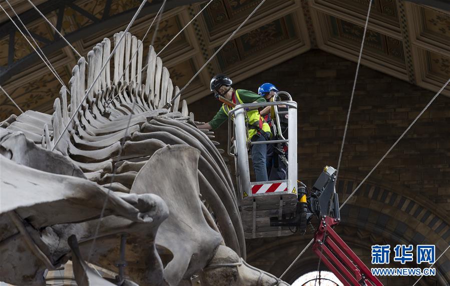 7月27日,工作人員在英國(guó)倫敦的自然歷史博物館大廳內(nèi)清潔一具藍(lán)鯨骨架。受新冠疫情影響關(guān)閉數(shù)月的英國(guó)自然歷史博物館將于8月5日重新對(duì)外開(kāi)放,目前館方正在為重新開(kāi)放做最后準(zhǔn)備。參觀者需要提前預(yù)約參觀時(shí)段、全程佩戴口罩且保持安全距離。新華社記者韓巖攝