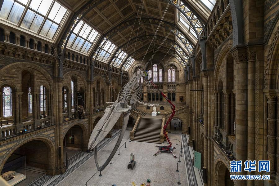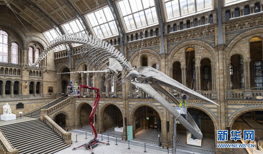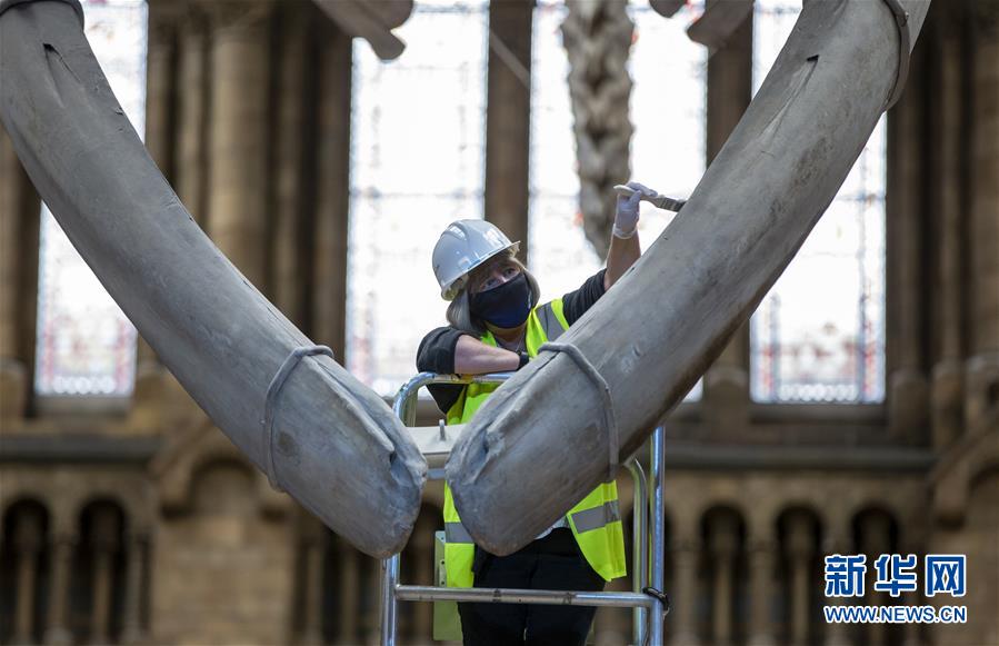 7月27日,工作人員在英國倫敦的自然歷史博物館大廳內(nèi)清潔一具藍鯨骨架。受新冠疫情影響關(guān)閉數(shù)月的英國自然歷史博物館將于8月5日重新對外開放,目前館方正在為重新開放做最后準備。參觀者需要提前預(yù)約參觀時段、全程佩戴口罩且保持安全距離。新華社記者韓巖攝