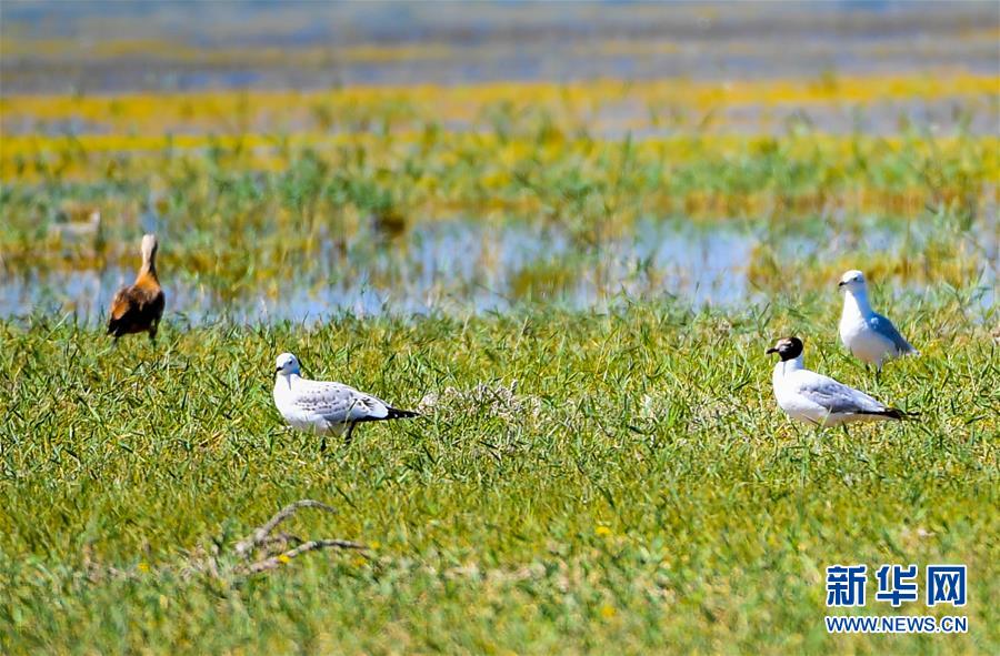 7月28日,灰雁和遺鷗在桃力廟—阿拉善灣海子覓食。鄂爾多斯?jié)竦匚挥趲觳箭R沙漠、毛烏素沙地接壤地帶,2002年被列入國際重要濕地名錄。從2006年開始,由于濕地湖面萎縮、湖心島消失,在此筑巢繁殖的世界瀕危物種遺鷗幾近消失。近年來,當(dāng)?shù)夭扇《喾N治理措施,濕地生態(tài)環(huán)境逐步好轉(zhuǎn)。2019年起,濕地內(nèi)的桃力廟—阿拉善灣海子迎來遺鷗大規(guī)?!盎貧w”。如今,40多種鳥類在此棲息,鄂爾多斯?jié)竦刂匦鲁蔀轼B類的樂園。新華社記者彭源攝