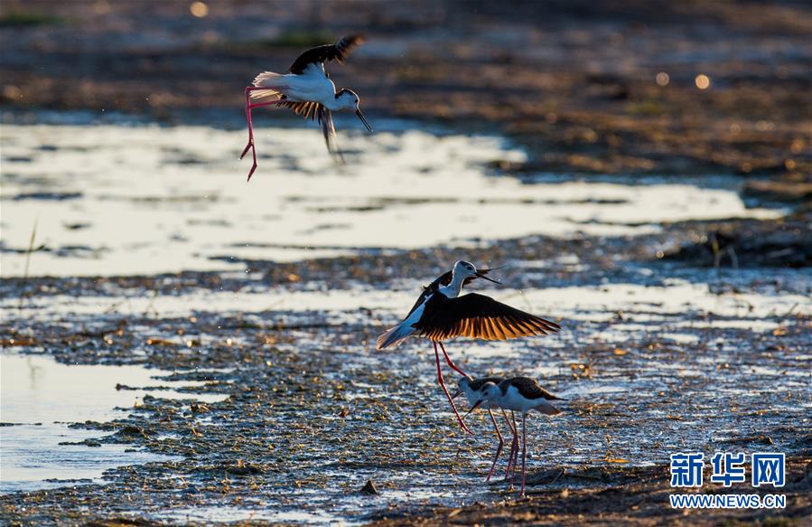 7月28日,在鄂爾多斯?jié)竦靥伊R—阿拉善灣海子,兩只長腳鷸在爭斗。鄂爾多斯?jié)竦匚挥趲觳箭R沙漠、毛烏素沙地接壤地帶,2002年被列入國際重要濕地名錄。從2006年開始,由于濕地湖面萎縮、湖心島消失,在此筑巢繁殖的世界瀕危物種遺鷗幾近消失。近年來,當?shù)夭扇《喾N治理措施,濕地生態(tài)環(huán)境逐步好轉(zhuǎn)。2019年起,濕地內(nèi)的桃力廟—阿拉善灣海子迎來遺鷗大規(guī)模“回歸”。如今,40多種鳥類在此棲息,鄂爾多斯?jié)竦刂匦鲁蔀轼B類的樂園。新華社記者連振攝