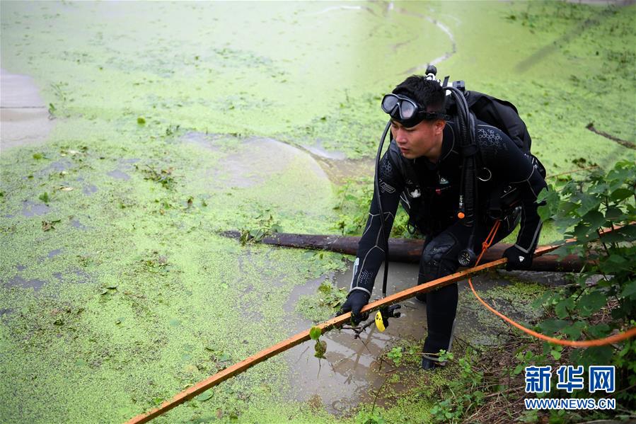 7月24日,在安徽省廬江縣臺(tái)創(chuàng)園小南河段,吳正寶下水前清理水上雜物。新華社記者劉軍喜攝