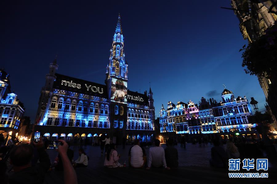 7月29日,人們在比利時布魯塞爾大廣場欣賞聲光秀,市政廳外墻上投射出“想念你,音樂”的字樣。7月29日,比利時布魯塞爾大廣場舉行大型聲光秀。藝術家在市政廳等歷史建筑上投影文字和圖案,紀念這個夏天受新冠疫情影響而不能如期舉辦的文化活動。新華社記者鄭煥松攝