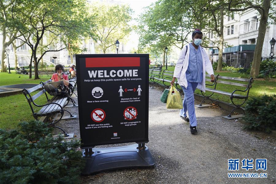 7月29日,在美國(guó)紐約,一名女子從公園內(nèi)的防疫提示牌旁走過(guò)。美國(guó)約翰斯·霍普金斯大學(xué)實(shí)時(shí)統(tǒng)計(jì)數(shù)據(jù)顯示,截至29日,美國(guó)累計(jì)新冠確診病例已超過(guò)440萬(wàn)例,累計(jì)死亡病例超過(guò)15萬(wàn)例。新華社記者王迎攝