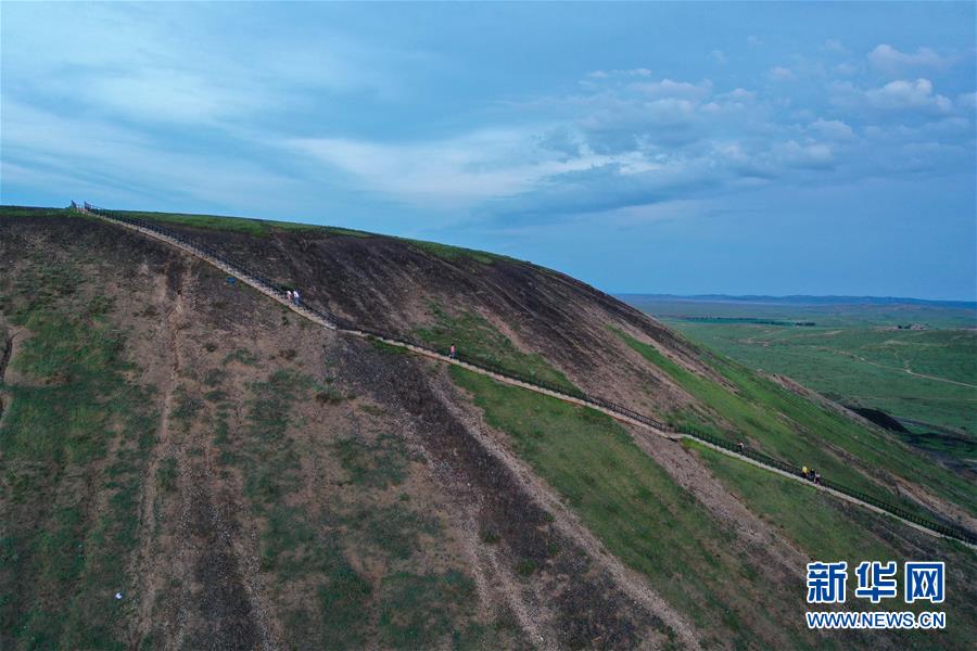 7月29日,游客在烏蘭哈達火山群的一座火山上游玩(無人機照片)。新華社記者劉磊攝
