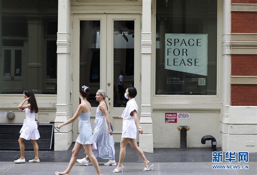 7月30日,在美國(guó)紐約蘇豪商業(yè)區(qū),人們從一家招租的店面旁走過(guò)。美國(guó)商務(wù)部30日公布的首次預(yù)估數(shù)據(jù)顯示,受新冠疫情導(dǎo)致經(jīng)濟(jì)大面積“停擺”和消費(fèi)停滯拖累,今年第二季度美國(guó)實(shí)際國(guó)內(nèi)生產(chǎn)總值(GDP)按年率計(jì)算下滑32.9%,創(chuàng)1947年有記錄以來(lái)最大降幅。新華社記者王迎攝