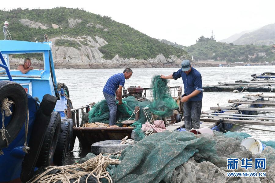 8月3日,福建霞浦縣三沙鎮(zhèn)漁民在漁排上整理漁具準備上岸避風。新華社記者林善傳攝