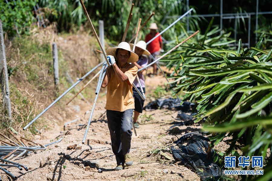 受近期多輪強降水引發(fā)的山洪影響,位于湖南省保靖縣碗米坡鎮(zhèn)首八峒村的易甸園水果有限公司種植基地大棚內(nèi)上百株火龍果枝條受損,當?shù)卮迕裾ゾo搶修大棚,降低災(zāi)害損失。新華社記者李鑫攝