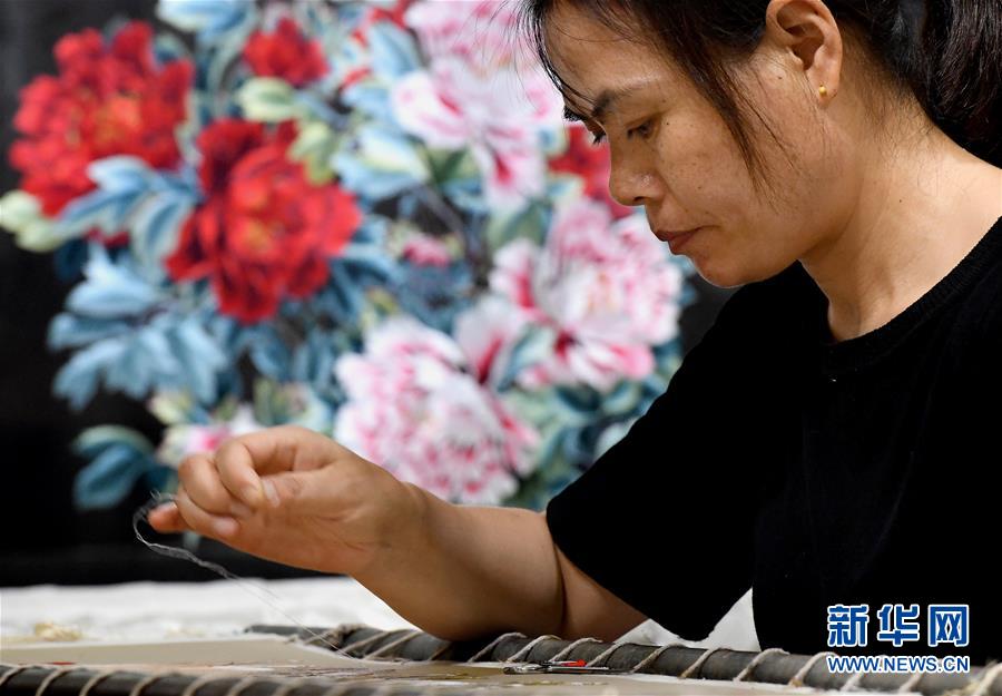 在開封市素花宋繡工藝有限公司的展示館里,王素花的徒弟劉冬紅在刺繡(7月30日攝)。新華社記者李安攝