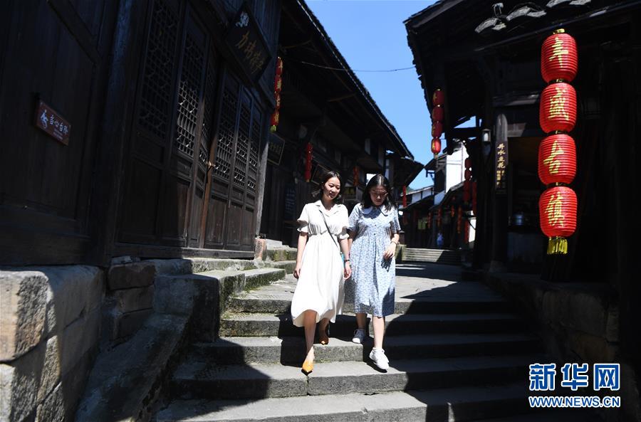 8月5日,游客在豐盛古鎮(zhèn)游覽。近年來,重慶市巴南區(qū)引入社會(huì)資本,按照“修舊如舊、適度開發(fā)”的原則對(duì)豐盛古鎮(zhèn)進(jìn)行保護(hù)性修繕和景區(qū)化打造,讓古鎮(zhèn)在保留原有歷史人文風(fēng)貌的同時(shí),煥發(fā)新活力。新華社記者王全超攝