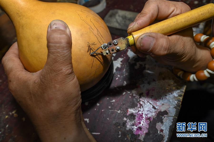 8月5日,侯景偉在葫蘆上進(jìn)行創(chuàng)作。今年55歲的吉林四平人侯景偉自幼與家人學(xué)習(xí)雕刻、烙畫藝術(shù)。經(jīng)過多年潛心研究,他將浮雕和烙畫工藝相結(jié)合,通過拋光、起稿、雕刻、烙燙、套色等十余道工藝,制作展現(xiàn)傳統(tǒng)文化、民俗故事的葫蘆工藝品。2020年,侯景偉被評為四平市非物質(zhì)文化遺產(chǎn)項(xiàng)目侯氏葫蘆雕刻烙畫代表性傳承人。他說:“希望有更多人加入到非遺傳承隊(duì)伍中,讓小葫蘆‘講’出更多民俗故事。”新華社記者張楠攝