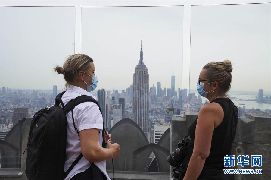 8月6日,在美國紐約,人們在洛克菲勒中心觀景臺上觀看城市景觀。當日,3月份暫時關(guān)閉的洛克菲勒中心觀景臺恢復對公眾開放。每天13時至21時,人們可戴口罩前往參觀。新華社記者王迎攝