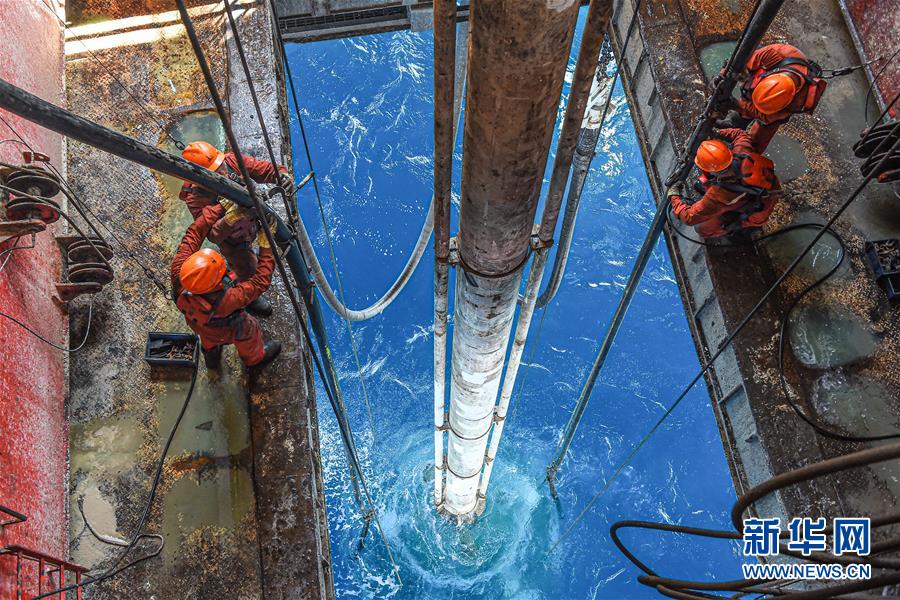 7月27日,工人在位于南海北部海域的勘探三號(hào)鉆井平臺(tái)上作業(yè)。新華社記者蒲曉旭攝