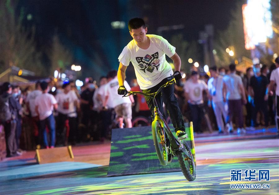 8月8日晚,自行車特技表演在望京小街商業(yè)街上演。新華社記者 陳鐘昊 攝