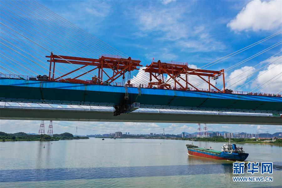 8月9日拍攝的廣州南沙港鐵路跨西江特大斜拉橋最后一塊鋼箱梁吊裝施工現(xiàn)場(無人機照片)。當(dāng)日,中鐵十一局承建的粵港澳大灣區(qū)基礎(chǔ)設(shè)施“硬聯(lián)通”重點工程——廣州南沙港鐵路跨西江特大斜拉橋完成最后一塊鋼箱梁吊裝作業(yè),大橋即將合龍。該橋位于廣東佛山市和江門市交界處,全長1117.5米。新華社記者劉大偉攝。