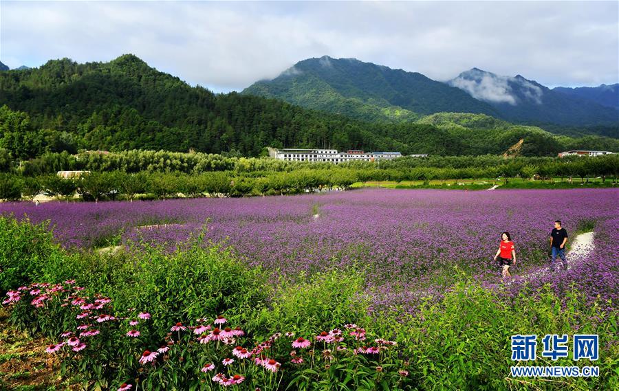 市民在位于陜西漢中市留壩縣城的金水灣花海散步(7月2日攝)。近年來(lái),陜西地處秦巴山區(qū)的多個(gè)縣市結(jié)合當(dāng)?shù)刈匀粴夂驐l件打造特色花海景觀,利用“花海經(jīng)濟(jì)”助力脫貧攻堅(jiān)和鄉(xiāng)村振興。新華社記者劉瀟攝。