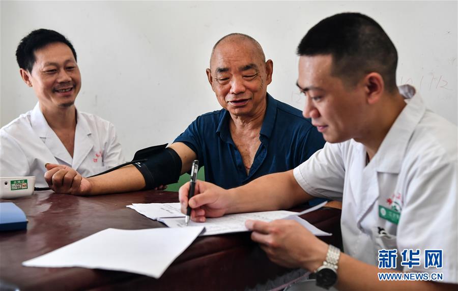 陜西安康市嵐皋縣佐龍鎮(zhèn)中心衛(wèi)生院的醫(yī)生在佐龍村對(duì)家庭醫(yī)生簽約服務(wù)對(duì)象進(jìn)行慢性病隨訪(7月30日攝)。目前,嵐皋縣組建了71個(gè)鎮(zhèn)級(jí)家庭醫(yī)生服務(wù)團(tuán)隊(duì)、15個(gè)縣級(jí)技術(shù)指導(dǎo)團(tuán)隊(duì),對(duì)貧困群眾開展重點(diǎn)人群免費(fèi)體檢、慢病隨訪、健康生活指導(dǎo)、健康扶貧政策宣傳等簽約服務(wù)項(xiàng)目。新華社記者劉瀟攝。