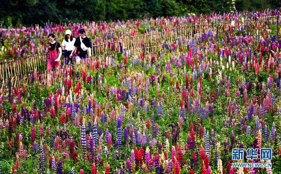 游客在陜西寶雞市太白縣咀頭鎮(zhèn)七里川村的魯冰花產(chǎn)業(yè)園內(nèi)觀光游覽(7月4日攝)。近年來(lái),陜西地處秦巴山區(qū)的多個(gè)縣市結(jié)合當(dāng)?shù)刈匀粴夂驐l件打造特色花海景觀,利用“花海經(jīng)濟(jì)”助力脫貧攻堅(jiān)和鄉(xiāng)村振興。新華社記者劉瀟攝。