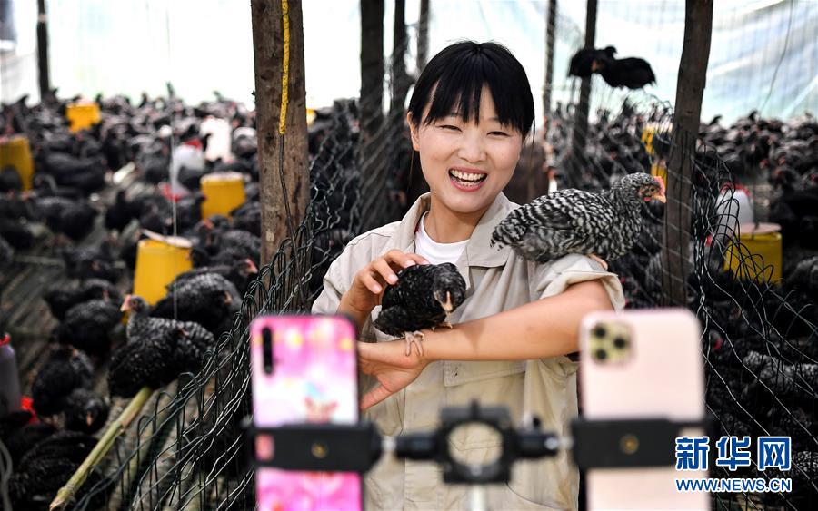陜西商洛市丹鳳縣寺坪鎮(zhèn)寺坪村的網(wǎng)絡(luò)主播李萌在直播介紹自家養(yǎng)的蘆花雞(7月20日攝)。陜西丹鳳縣位于秦嶺東段南麓,依山傍水、農(nóng)特產(chǎn)品豐富。近年來,隨著網(wǎng)絡(luò)銷售模式的興起,當(dāng)?shù)胤e極培育壯大“本土網(wǎng)紅”隊(duì)伍,通過網(wǎng)絡(luò)直播、線上銷售、線下配送等形式,助力秦嶺山區(qū)優(yōu)質(zhì)農(nóng)產(chǎn)品走出大山,帶動(dòng)百姓增收致富。新華社記者劉瀟攝。