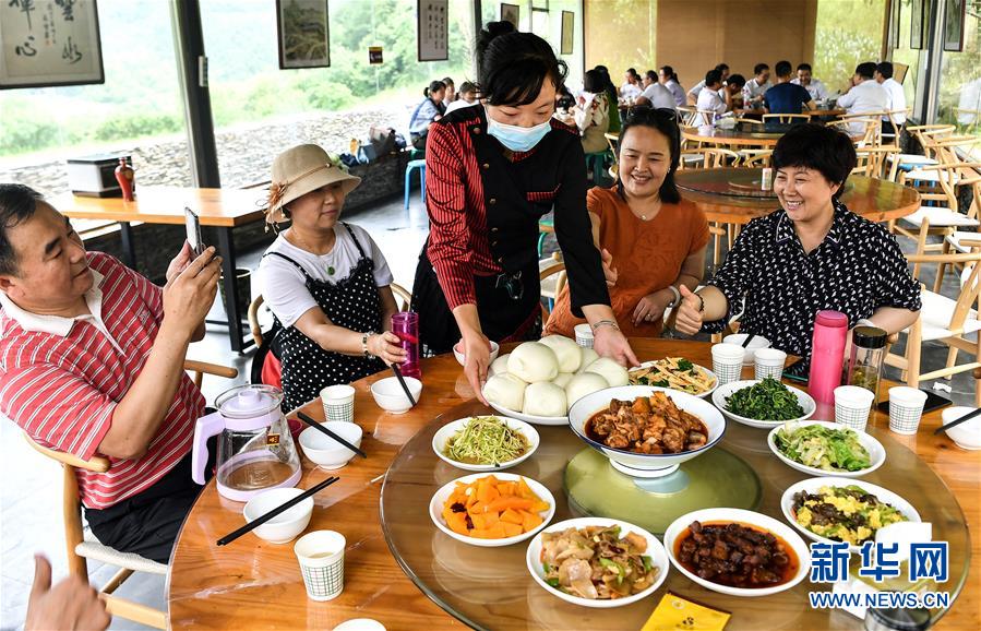 游客在陜西寶雞市太白縣咀頭鎮(zhèn)白云村的一家農(nóng)家樂里就餐(7月5日攝)。白云村是秦嶺深處的小山村,2016年建檔立卡貧困戶303人。近年來,為了徹底改變貧困面貌,白云村依靠當(dāng)?shù)匾郎桨牡赜騼?yōu)勢,全面提升人居環(huán)境和村容村貌,發(fā)展鄉(xiāng)村旅游,讓群眾持續(xù)增收。目前,白云村已實現(xiàn)整體脫貧,2019年全村人均純收入12880元。新華社記者劉瀟攝。