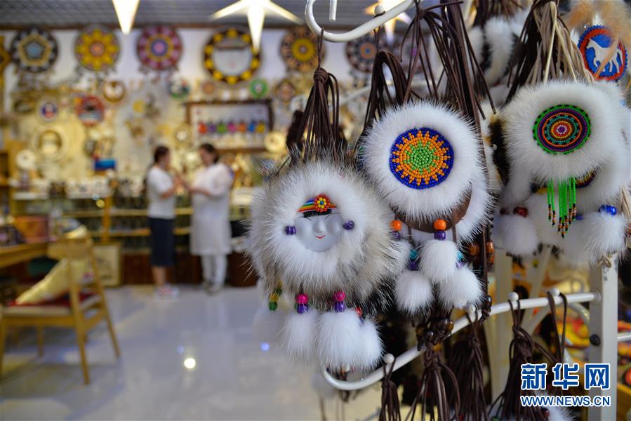 這是在內(nèi)蒙古自治區(qū)鄂溫克族自治旗巴彥托海鎮(zhèn)太陽花傳承發(fā)展中心展示的“太陽花”產(chǎn)品(8月7日攝)。新華社記者徐欽攝。