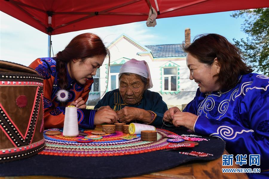 在內(nèi)蒙古自治區(qū)鄂溫克族自治旗巴彥托海鎮(zhèn)太陽花傳承發(fā)展中心,艾吉瑪(中)和手工藝人交流制作工藝(8月6日攝)。新華社記者劉磊攝。