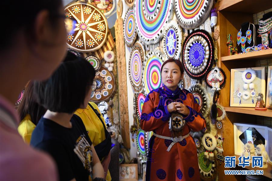 在內(nèi)蒙古自治區(qū)鄂溫克族自治旗巴彥托海鎮(zhèn)太陽花傳承發(fā)展中心,艾吉瑪(右一)在給游客介紹太陽花手工藝品(8月6日攝)。新華社記者劉磊攝。
