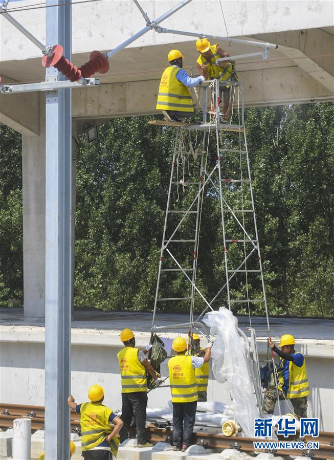 8月10日,工人在京雄城際鐵路霸州北站建設工地為接觸網卡定位。京雄城際鐵路霸州北站站臺雨棚混凝土結構施工日前全部完成,目前霸州北站已全面轉入裝飾裝修和機電安裝階段,預計2020年底投入使用。京雄城際鐵路是連接北京市區(qū)、大興機場和雄安新區(qū)的重要干線。建成后,將進一步完善京津冀區(qū)域高速鐵路網結構,便利沿線群眾出行,對于推動京津冀協(xié)同發(fā)展和支撐建設雄安新區(qū)具有重要意義。新華社記者李曉果攝。