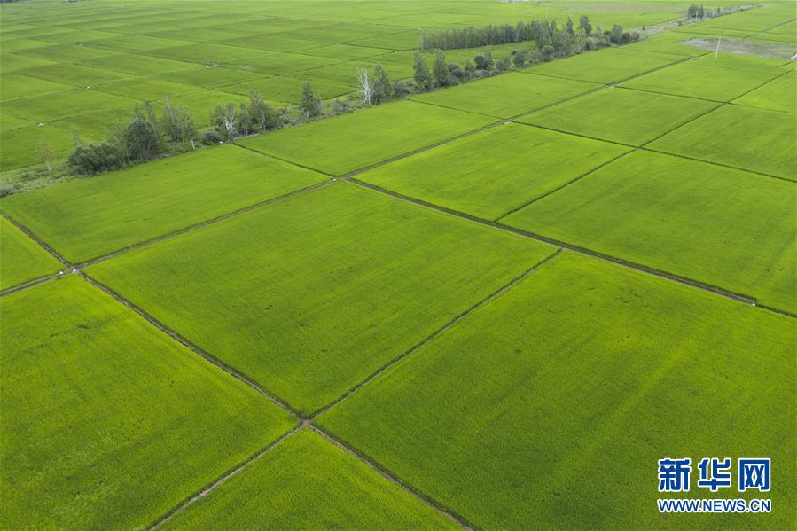 8月11日在撫遠(yuǎn)市拍攝的稻田(無人機(jī)照片)。時(shí)下,“華夏東極”黑龍江省撫遠(yuǎn)市的水稻長勢(shì)良好,蒼翠的稻田一望無際,猶如綠毯鋪在大地上。新華社記者謝劍飛攝。