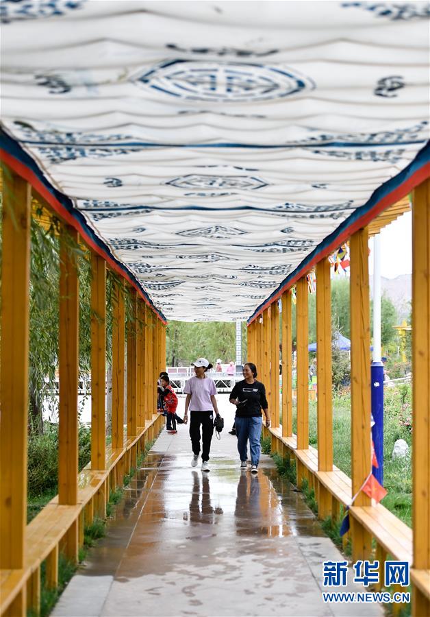 8月11日,游客在尖扎縣昂拉鄉(xiāng)德吉村景觀長廊內游玩。新華社記者張龍攝