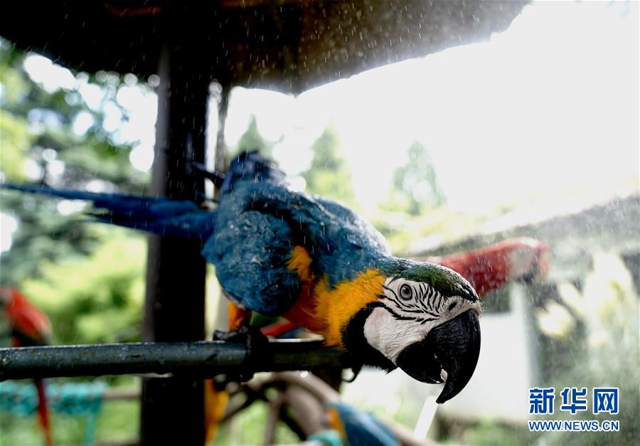 8月11日,上海動(dòng)物園的金剛鸚鵡在享受噴淋降溫。當(dāng)日,上海最高溫度達(dá)到35攝氏度,上海動(dòng)物園開(kāi)啟園內(nèi)安裝的各種噴淋裝置,讓動(dòng)物們防暑降溫,樂(lè)享清涼。新華社記者張建松攝
