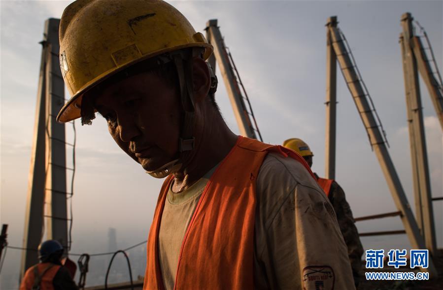 8月11日,工人在武漢綠地中心項(xiàng)目建設(shè)現(xiàn)場(chǎng)近500米的高空施工。新華社記者肖藝九攝