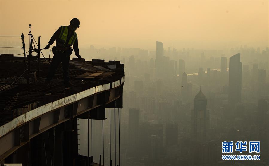 8月11日,工人在武漢綠地中心項目建設現(xiàn)場近500米的高空施工。新華社記者肖藝九攝