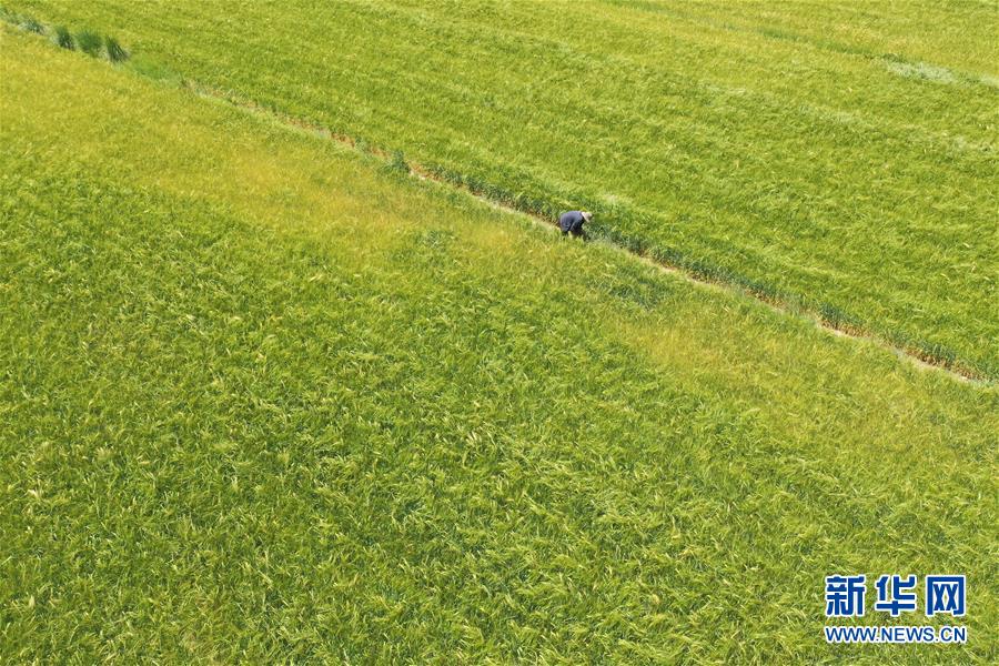 甘肅省金昌市永昌縣下四壩村村民徐文國在地里勞作(7月10日攝,無人機(jī)照片)。新華社記者 杜哲宇 攝