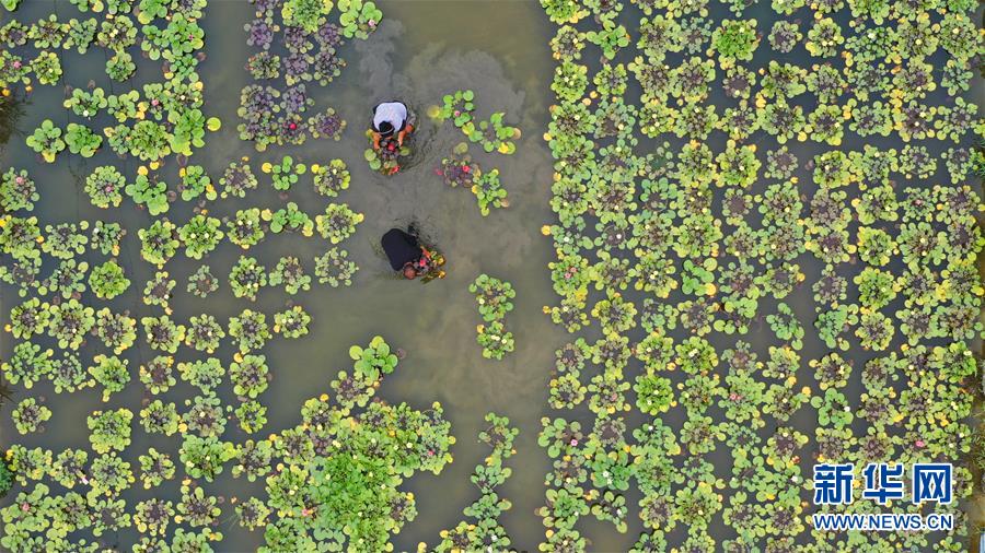 8月12日,河北省灤州市茨榆坨鎮(zhèn)草塘坨村花農(nóng)在大棚內(nèi)打理種植的蓮花(無人機(jī)照片)。新華社記者 牟宇 攝