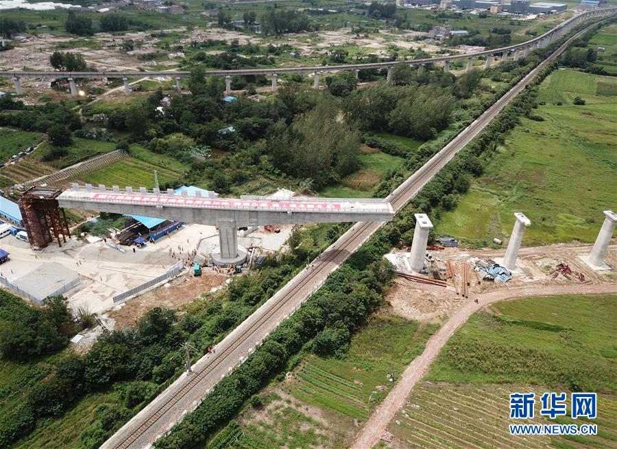 這是8月12日拍攝的水蚌鐵路蚌埠段改線工程東站疏解線特大橋跨越京滬鐵路上行線轉體梁轉體施工現(xiàn)場(無人機照片)。新華社記者 劉軍喜 攝
